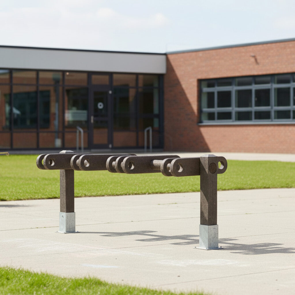 Un patio educativo suele incorporar zonas de trabajo exterior, espacios de reunión, áreas flexibles para grupos y mobiliario pensado para usos pedagógicos.