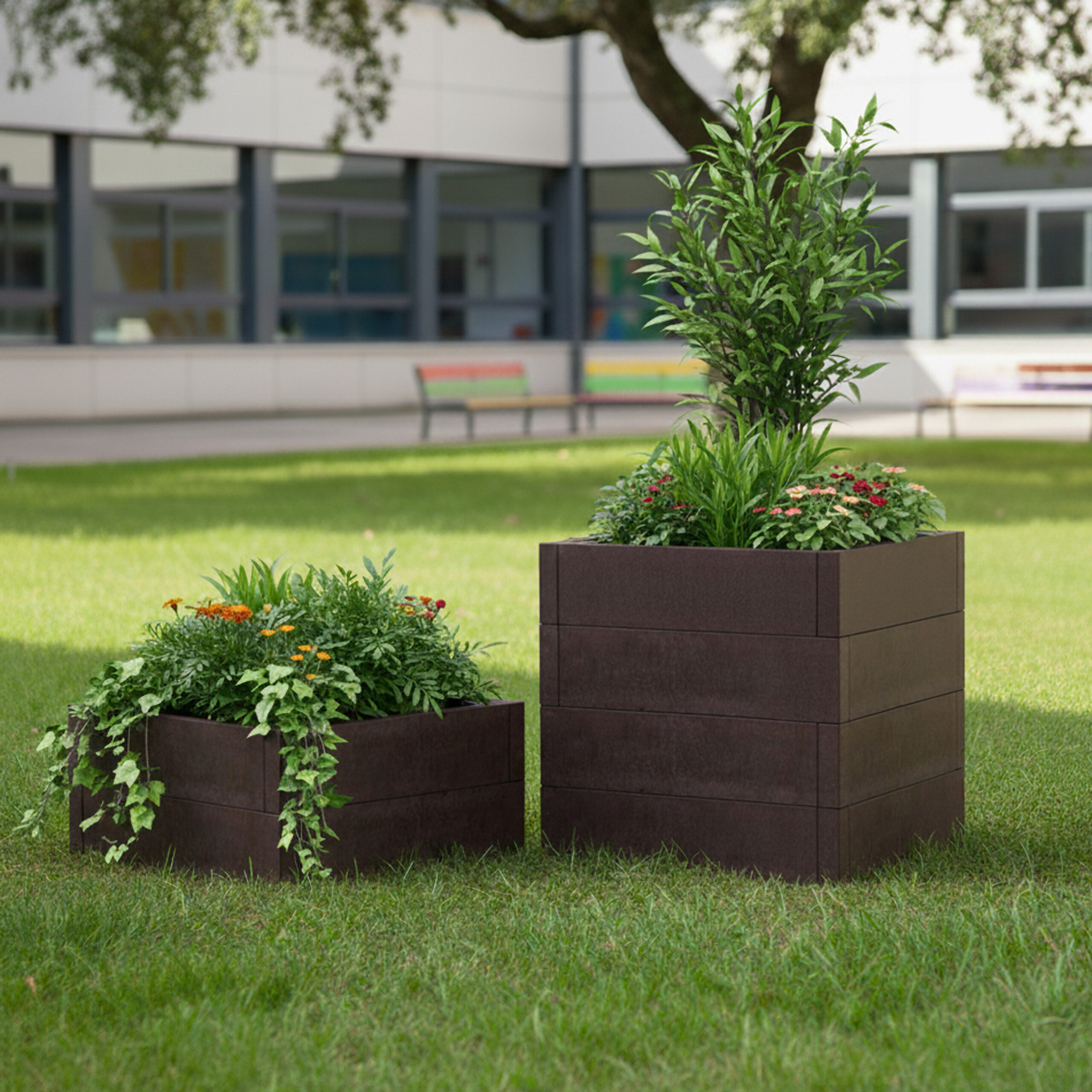 El módulo CUADRADOO es un elemento pensado para su uso en la creación de jardines adaptables a cualquier espacio, actuando como jardinera en su opción sin tapa, o como superficie de paso o estancia en su versión cubierta. El módulo CUADRADOO puede combinarse con los módulos HEXÁGONOO y TRIÁNGULOO para conseguir una mayor adaptabilidad al espacio mediante el uso de diferentes elementos y formas, pudiendo ampliarse o reducirse (según convenga) el área de intervención atendiendo a la disposición de las piezas o situando estas a diferentes alturas.
