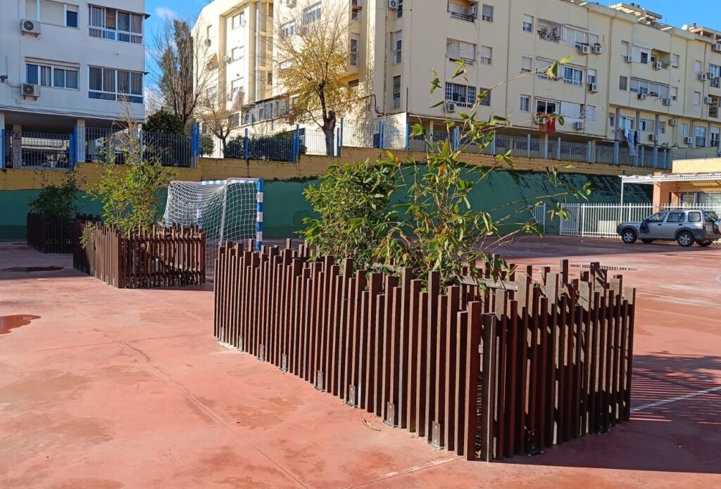 La Urdimbre es el estudio de arquitectura responsable del proyecto, quienes, junto al centro, han determinado que dentro de las intervenciones planteadas para dotar a los patios de sombra a través del plantado de bambú no invasivo, el vallado fabricado con polímeros reciclados sea uno de los elementos protagonistas.